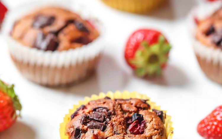 This is placeholder text. To Mix all dry ingredients, except the chocolate chips, and then mix in all wet ingredients. Stir until a smooth batter is formed, then lightly stir in strawberries and chocolate chips (leave a few aside to top the muffins).